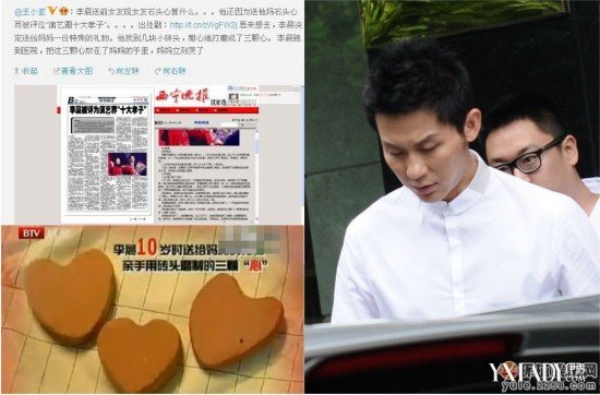 11年李晨被评为演艺界“十大孝子”,文章中称李晨年幼时其母亲生病住院,李晨思来想去想要送给母亲一份特殊的礼物,於是他找到几块小砖头,耐心打磨成了三颗心,两颗大心和一颗小心,这三颗心象征着一家人的心永远在一起。李晨的这一事迹曾令不少粉丝为之动容。原来李晨送出的石头心不止张馨予有,李晨的妈妈、前女友、朋友几乎人手一个,而且刚好集齐了七颗石头。