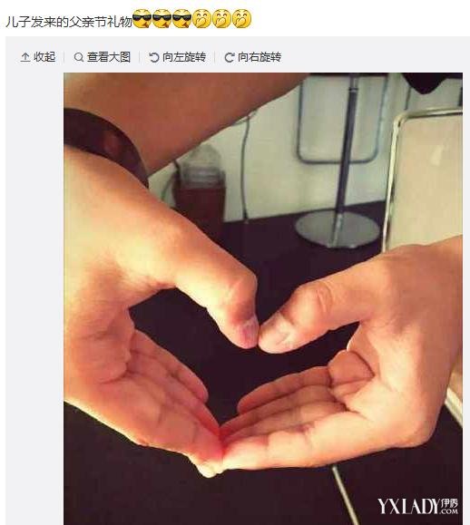 陈坤在微博中晒出了儿子送给自己的父亲节礼物:一个用手比划出来的心形,而陈坤也用一连串得意和捂嘴笑的表情表达自己身为人父的幸福。